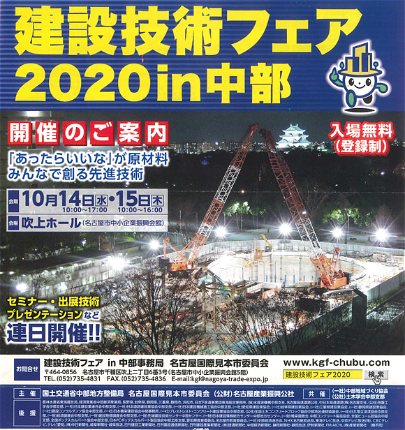 当社は、10月14日(水)、15日(木)に開催される「建設技術フェア2020in中部」(吹上ホール 名古屋市中小企業振興会館)に出展します。(屋外展示会場 W11ブース)