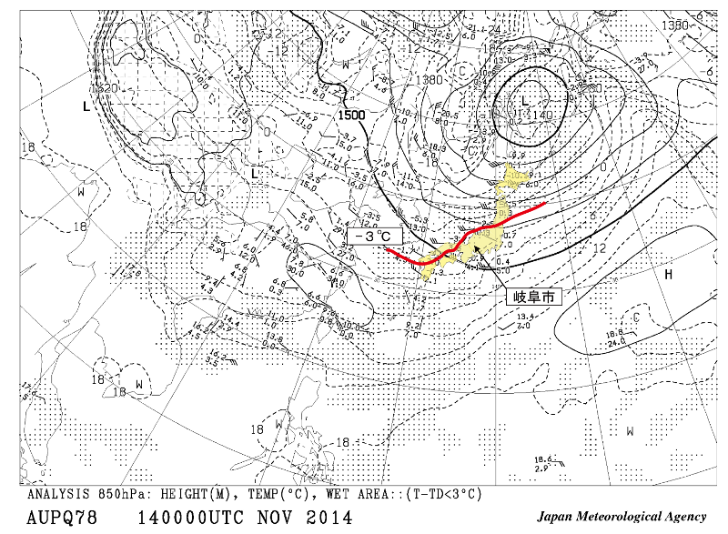 特に、850hPaは高度1500m付近に該当するため標高の高い所の気温予想に、また500hPaは上空の気圧の谷や寒気の強さの予想に利用されます。気温は高度が100m上がる毎に0.6~0.7℃下がることから、850hPaの気温が-3℃以下は雪、500hPaで-36℃以下になると大雪といわれています。