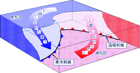 日本列島のある中緯度付近は、南の暖気と北の寒気がせめぎあっています。このせめぎあいの中で、何かの原因でどちらかが優勢になると前線が波うち、その中心に気圧の低い所ができ、低気圧が発生して等圧線が円形になります。