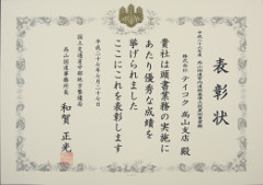 平成27年7月27日、高山国道事務所にて表彰式が行われ、当社の「平成二十六年度 高山国道管内道路基準点設置測量業務」に対し、国土交通省中部地方整備局 高山国道事務所より所長表彰を拝受しました。 今後も発注者の期待に応えるべく、更に技術を研鑽していきます。