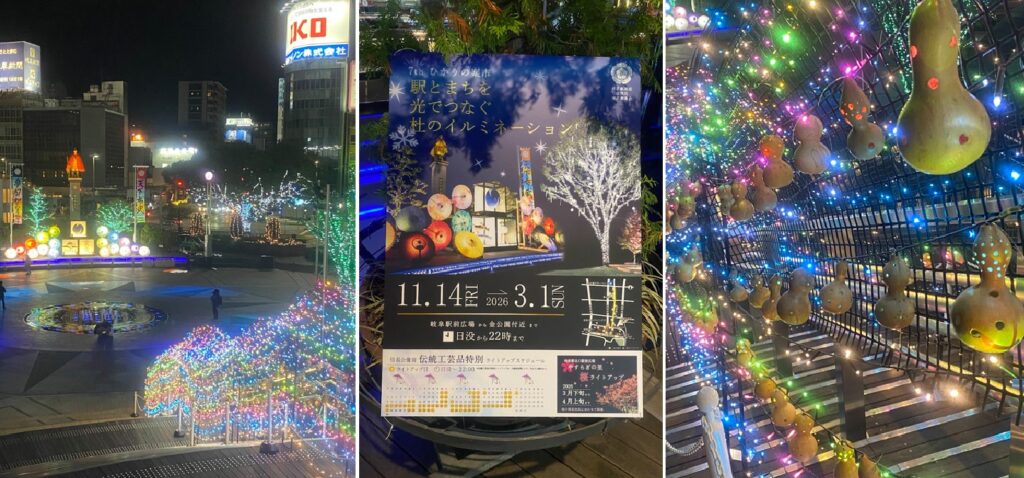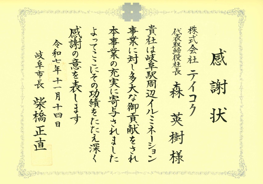 岐阜駅周辺の活性化や賑わいの創出を目的として、令和元年から「駅とまちを光でつなぐ杜のイルミネーション」が開催されています。今年で7年目となる今回も、岐阜駅前広場での伝統工芸品ライトアップや駅前広場から金公園までのイルミネーションなど、彩とりどりの光が訪れた人を魅了しています。当社は、この事業に今年も協賛し、柴橋正直岐阜市長から感謝状を拝受しました。