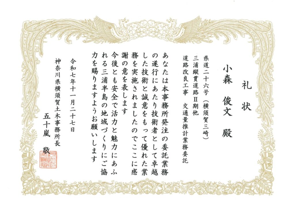 神奈川県横須賀土木事務所から令和7年度所長礼状を拝受しました 当社は、令和7年度横須賀土木事務所優良工事等施工業者顕彰式にて、『県道二十六号(横須賀三崎)三浦縦貫道路Ⅱ期他 道路改良工事 交通量推計業務委託』での取組姿勢や成果などが評価され、所長礼状を拝受しました。 これを励みに、より良い社会インフラ整備に貢献できるよう、技術力の向上と真摯な姿勢をもって、これからも取り組んでまいります。